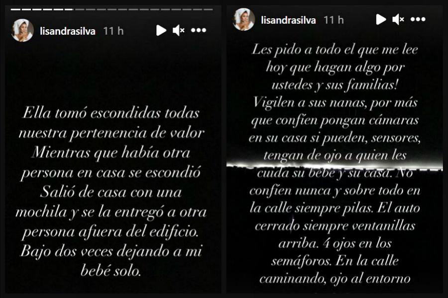 Lisandra Silva dedicó varias historias en su Instagram para relatar una difícil experiencia que sucedió al interior de su hogar. Ella culpó el descuido de una persona que trabajaba al cuidado de su hijo, quien a su vez habría sido víctima del delito de estafa y robo.
