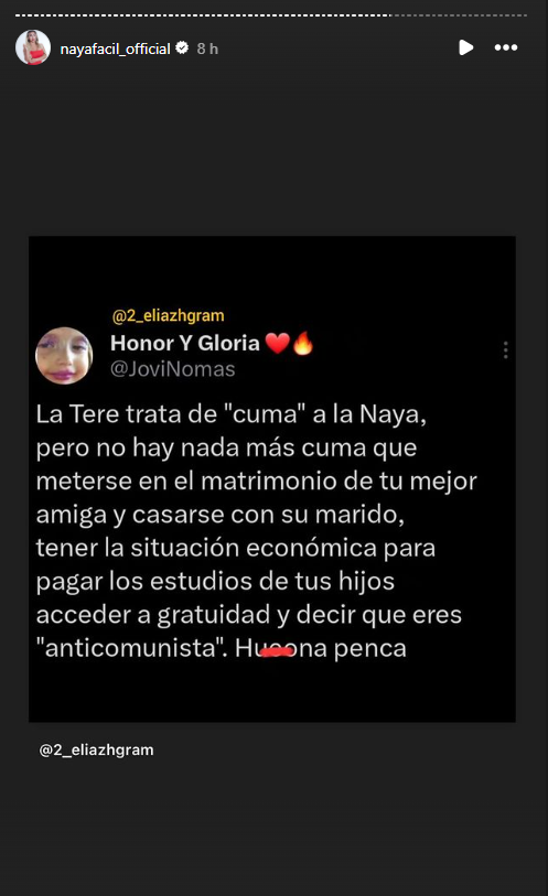 De hecho, en ese momento la joven se encargó de compartir otra publicación, donde acusaban a la ex constituyente de meterse en la relación de una amiga. Una aseveración a la que no se ha referido Marinovic.