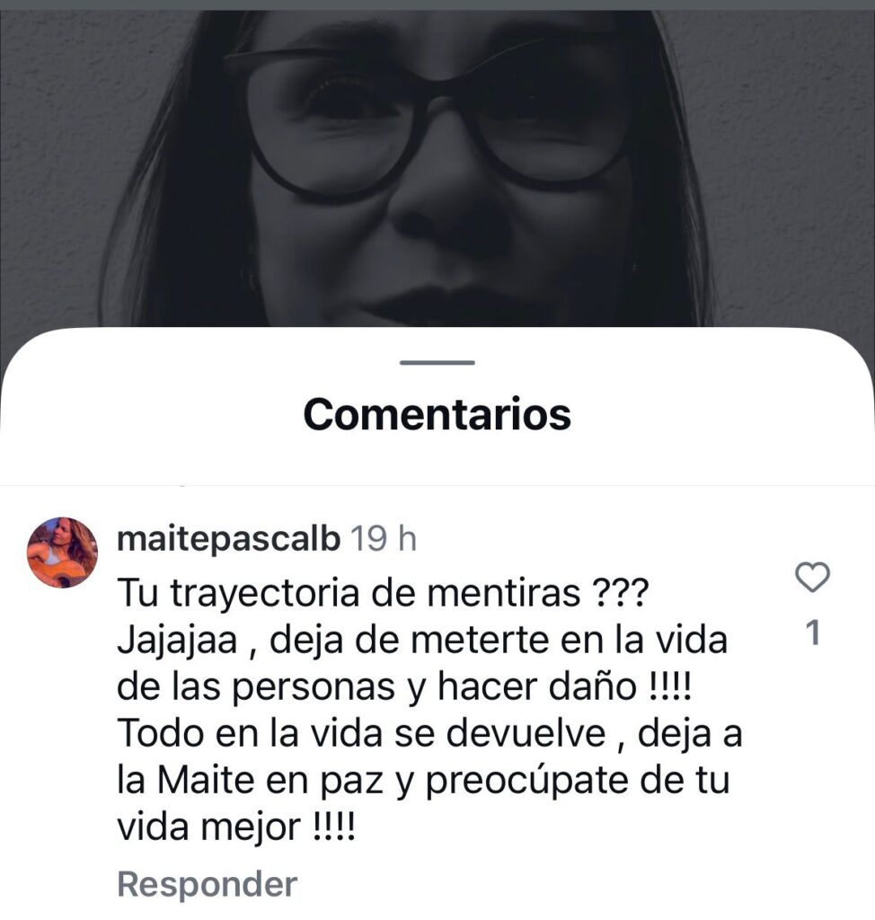 Finalmente, la actriz concluyó: “Todo en la vida se devuelve, ¡deja a la Maite en paz y preocúpate de tu vida mejor!”.