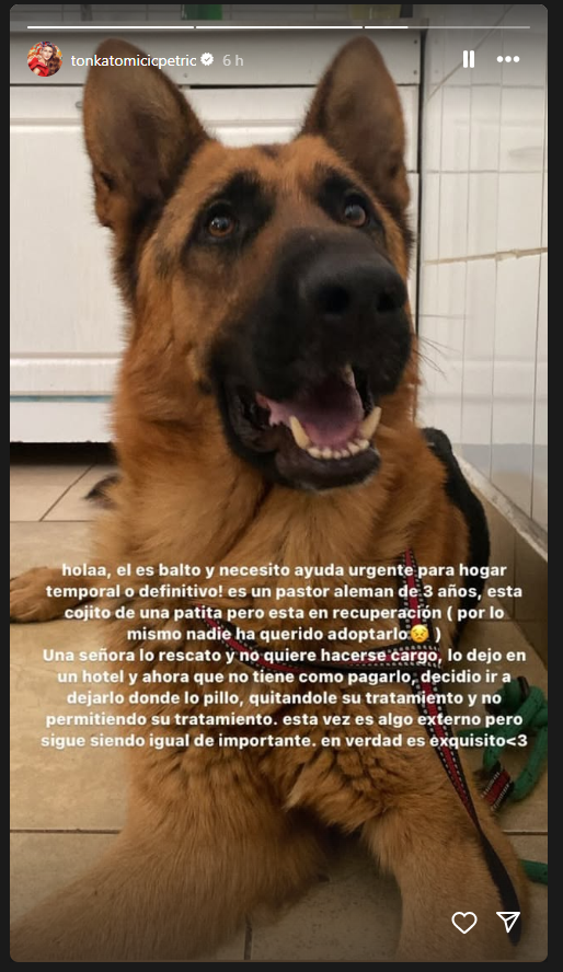 "Hola, él es Balto y necesito ayuda urgente para hogar temporal o definitivo! Es un pastor alemán de 3 años, está cojito de una patita, pero está en recuperación (por lo mismo nadie ha querido adoptarlo", comenzó relatando Tomicic.