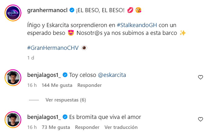 A través de la cuenta de Instagram oficial de Gran Hermano, Benjamín reaccionó al beso y aseguró: "Toy celoso, Eskarcita (sic)".