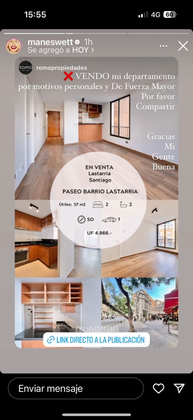 Mane Swett también dispuso una historia destacada en su perfil de Instagram, donde se puede acceder al sitio web de la corredora de propiedades para vender con mayor rapidez el departamento.