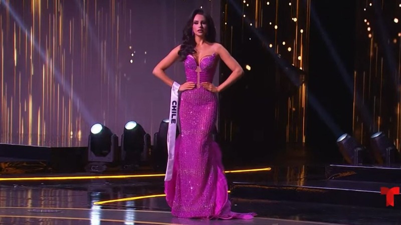 En una segunda instancia, la chilena hizo gala de su figura desfilando en Miss Universo Chile solamente con traje de baño y su banda con la palabra Chile.