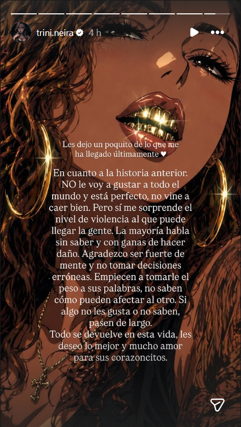 Tras exponer a sus “haters”, Trinidad publicó una reflexión en la que hizo un llamado a crear consciencia con quien está al otro lado de la pantalla. “Les dejo un poquito de lo que me ha llegado últimamente”, comenzó diciendo.