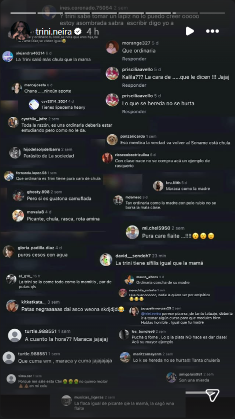 “Es una ordinaria, debería estar estudiando“, “Parásito de la sociedad”, “Patas negras”, “Tan ordinaria como la madre”, “Puros cesos con agua”, fueron algunos de los ataques que mostró.