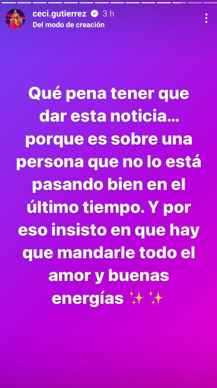 "Qué pena tener que dar esta noticia, porque es sobre una persona que no lo está pasando bien en el último tiempo. Y por eso insisto en que hay que mandarle todo el amor y buenas energías", escribrió en su cuenta de Instagram.