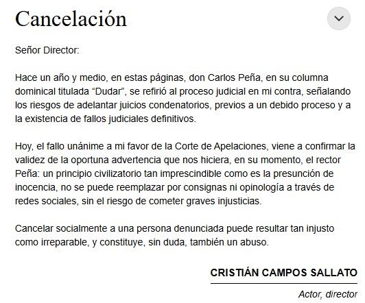 El actor comenzó la misiva recordando una carta al director que fue escrita por Carlos Peña, rector de la Universidad Diego Portales, en el mismo diario a inicios de 2024, donde menciona que Campos había sido "condenado al ostracismo".