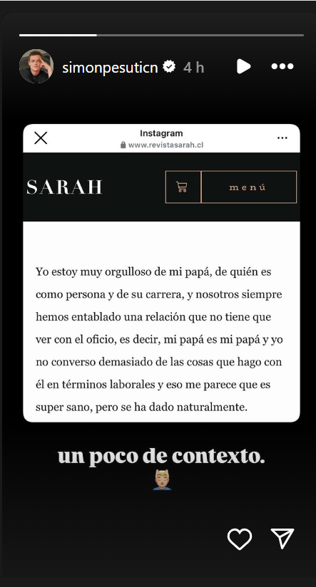 Asimismo, se agrega en el texto que "mi papá es mi papá y yo no converso demasiado de las cosas que hago con él en términos laborales y eso me parece súper sano, pero se ha dado naturalmente".