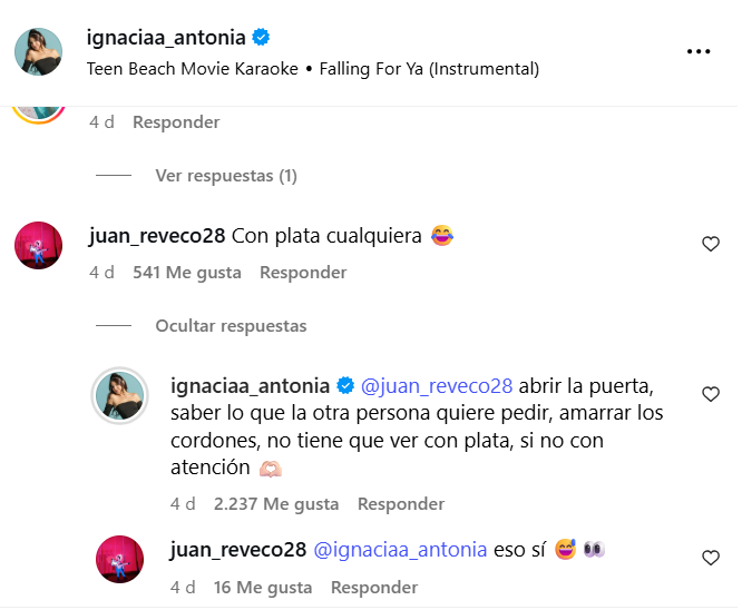 Tras esto, un usuario de Instagram encontró "excesivo" el trato de Bastián D'Amonte (nombre real) del cantante a Ignacia Antonia y comentó: "Con plata cualquiera", donde además agregó un emoji de risas.
