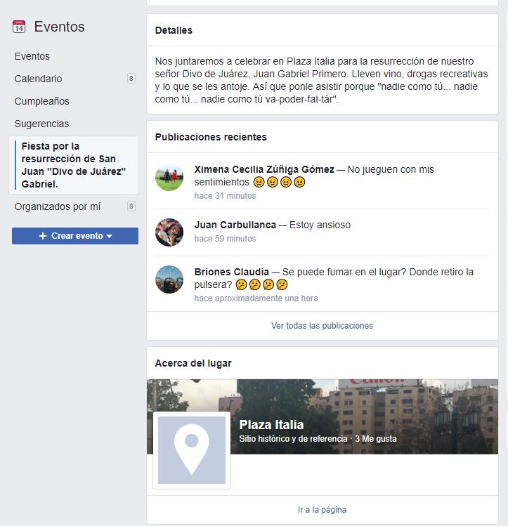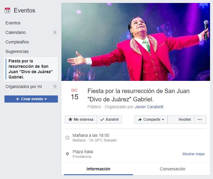 “Nos juntaremos a celebrar en Plaza Italia para la resurrección de nuestro señor Divo de Juárez, Juan Gabriel Primero”, dice el anuncio en Facebook, que ya suma casi seis mil personas que confirman su asistencia.