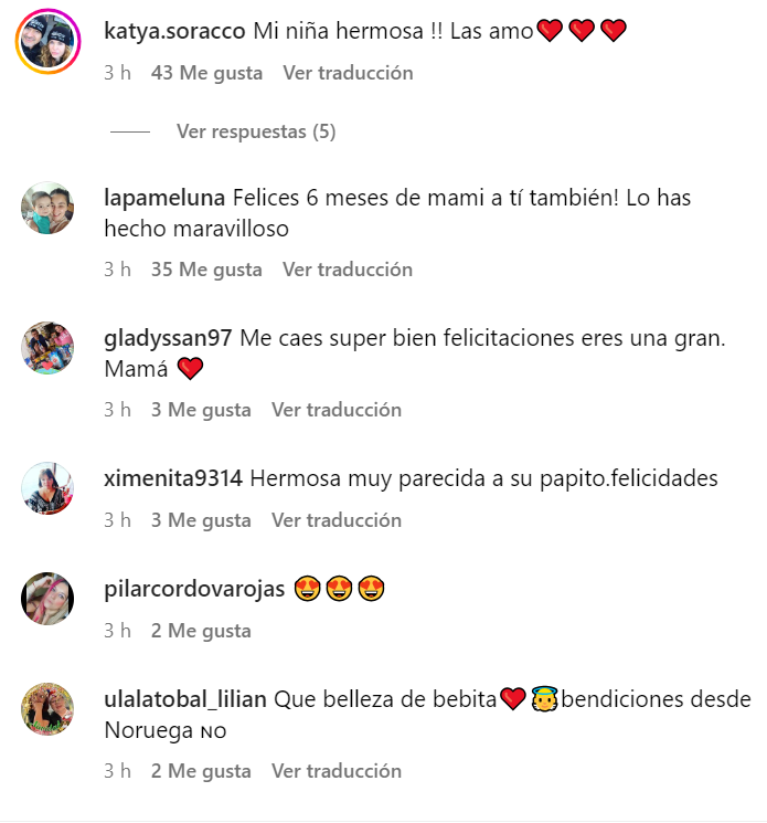 "¡Mi niña hermosa! Las amo", "¡Felices 6 meses de mami a ti también! Lo has hecho maravilloso", "Me caes súper bien, felicitaciones. Eres una gran mamá", fueron algunos de los que se pueden ver en los primeros lugares.