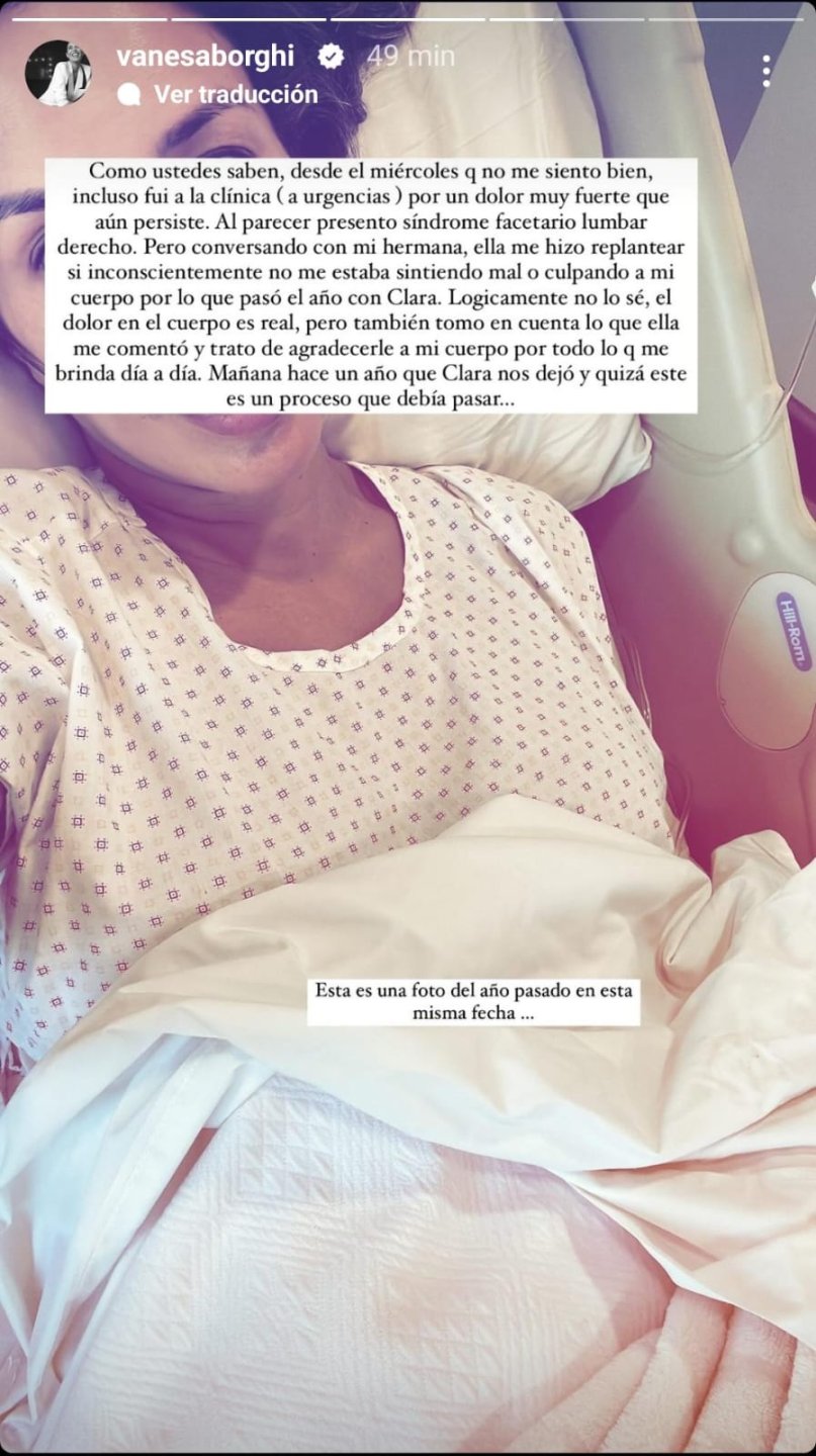 "Desde el miércoles que no me siento bien, fuimos a la clínica por un dolor muy fuerte que aún persiste. Al parecer presento el síndrome facetario lumbar", comenzó su desahogo Vanesa Borghi.