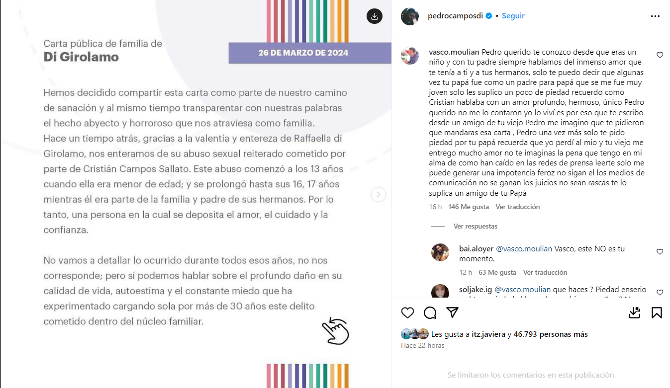 publicación del hijo de Cristian Campos, Pedro Campos, donde compartió el comunicado de la familia Di Girolamo, Moulian apeló a los sentimientos de este, pidiendo clemencia hacia su viejo amigo. "Pedro una vez más