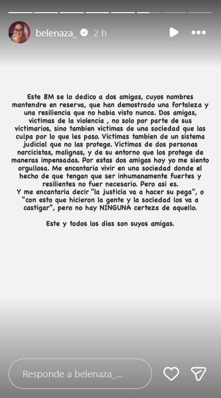 A través de su cuenta de Instagram, Belenaza sentenció: "Este 8M se lo dedico a dos amigas cuyos nombres mantendré en reserva, que han demostrado una fortaleza y una resiliencia que no había visto nunca".