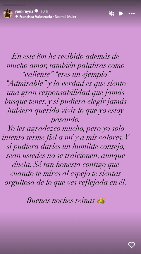 "En este 8M he recibido, además de mucho amor, también palabras como 'valiente', 'eres un ejemplo', 'admirable', y la verdad es que siento una gran responsabilidad que jamás busqué tener", comenzó señalando.