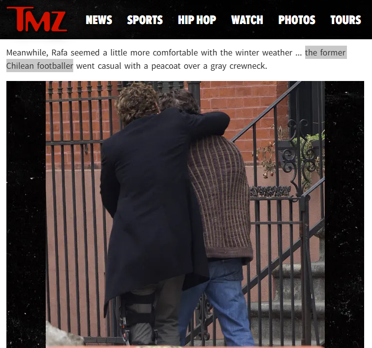 "Rafa parecía un poco más cómodo con el clima invernal... El exfutbolista chileno se puso informal con un abrigo sobre una camiseta de cuello redondo", informó TMZ en su nota.