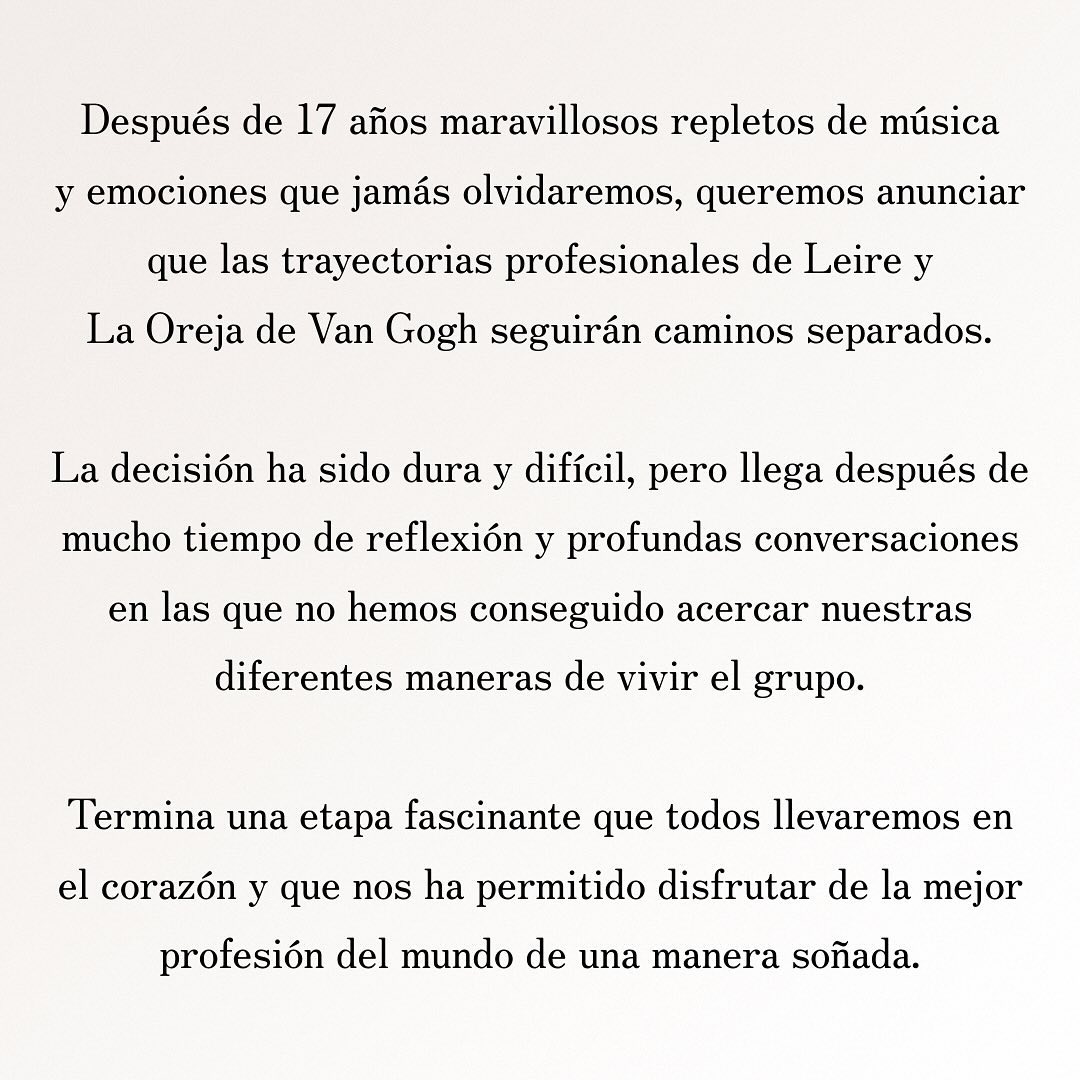 Sin embargo, ahora el cuarteto de hombres se vuelve a quedar sin la voz femenina que le da vida al grupo. "Después de 17 años maravillosos repletos de música y emociones que jamás olvidaremos, queremos anunciar que las trayectorias profesionales de Leire y La Oreja de Van Gogh seguirán caminos separados", escribieron en su cuenta de Instagram.