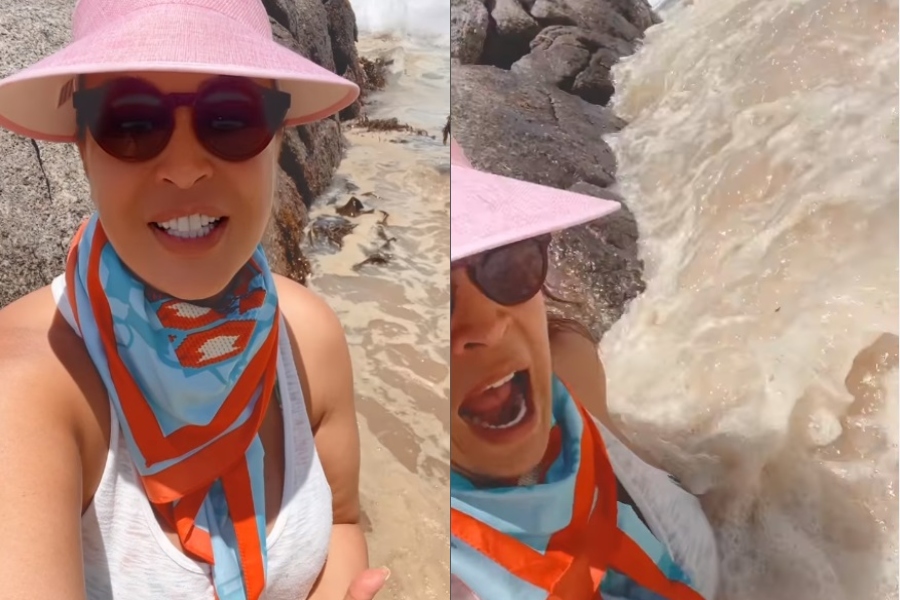 Durante este domingo, la empresaria se encontraba en el mar grabando un registro inspirador cuando una sorpresiva ola la botó al suelo. De todos modos, la reconocida figura de la televisión nacional se tomó el incidente con humor.