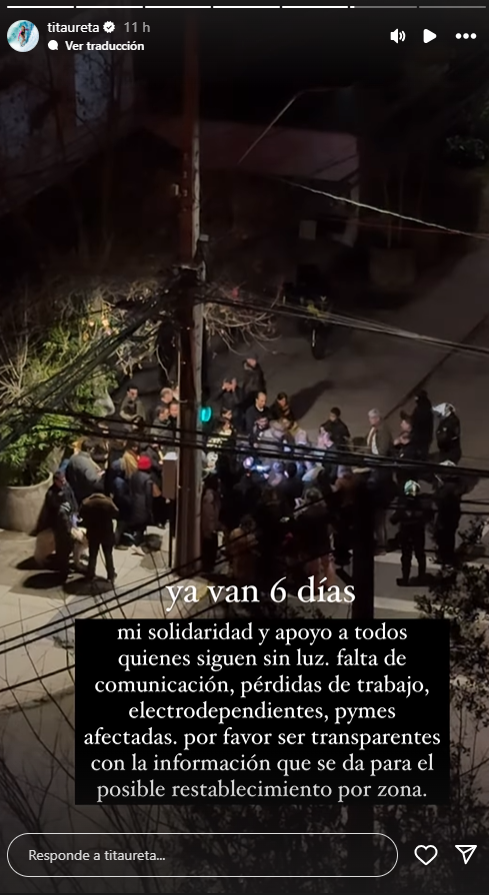 "Mi solidaridad y apoyo a todos quienes siguen sin luz. Falta comunicación, pérdidas de trabajo, electrodependientes, pymes afectadas", agregó.
