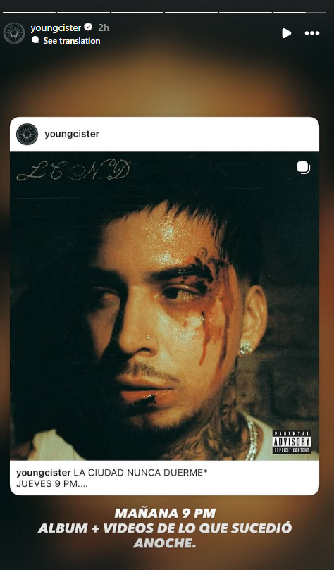 Por último, la publicación termina con un clip de 15 segundos en el que se aprecia con el mismo look dentro de un auto. Young Cister informó en Instagram que el horario de lanzamiento es a las 9 de la noche e irá acompañado de "videos de lo que sucedió anoche".