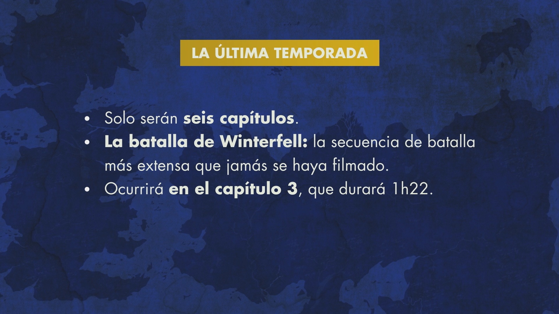 Lee también: Abuelita chilena de 95 años fanática de “Game of Thrones”: “Ojalá no morirme antes de que termine la serie”"Es lo que todos estamos esperando. Toda esta facción que está en Winterfell va a tener que enfrentarse a lo que ya se sabe se va a llamar "La Batalla de Winterfell". Es una batalla que incluso, en la producción, representó un esfuerzo tremendo, fue muy demandante para todo el elenco, para todo el equipo, grabaron durante 11 semanas todas las noches consecutivamente", afirmó.