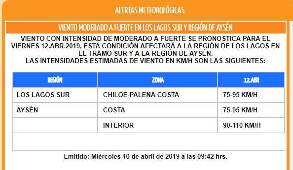 En cuanto a los vientos, la Dirección Meteorológica de Chile emitió una alerta en la que advierte de rachas superiores a 100 kilómetros por hora al interior de Aysén.