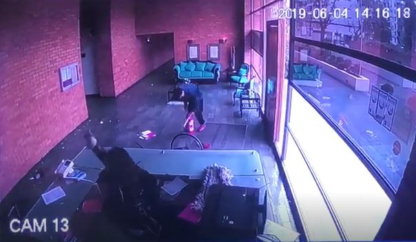 Sólo faltó la canción Naruto de fondo. Los dos delincuentes notaron que todas las salidas del edificio estaban bloqueadas y en su desesperación, sacaron un extintor, un destornillador e incluso un carro de supermercado. Hasta el libro de reclamos terminó volando por los aires.