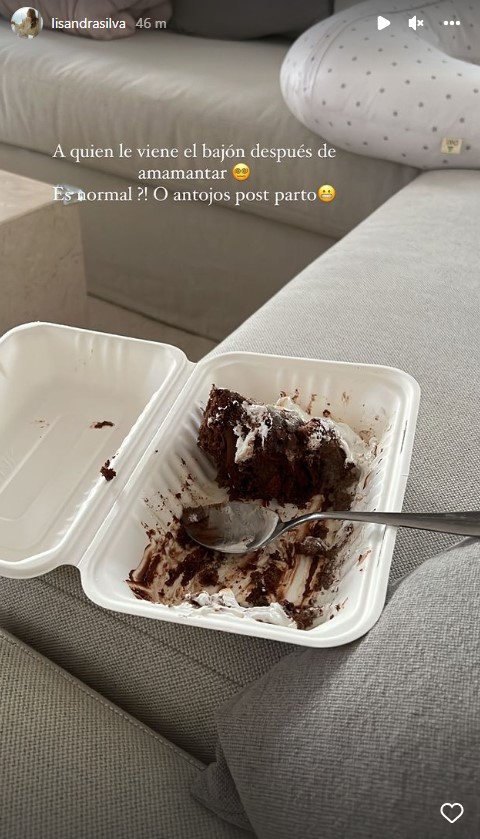 En esta oportunidad, la modelo subió a sus historias uno de los tantos antojos que le han dado tras el nacimiento de Leiah y consultó: ¿A quién le viene el bajón después de amamantar? Y añadió: ¡¿Es normal!? ¿O antojos post parto?