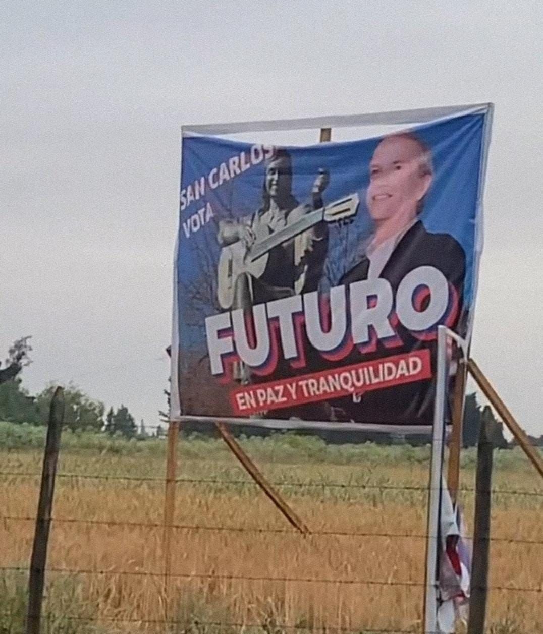El lienzo fue instalado en la comuna de San Carlos, en la Región del Ñuble, donde aparece el aspirante a La Moneda junto a la estatua de la cantautora ubicada en la misma localidad. Además, incluye un texto que llama a votar por un "futuro en paz y tranquilidad".