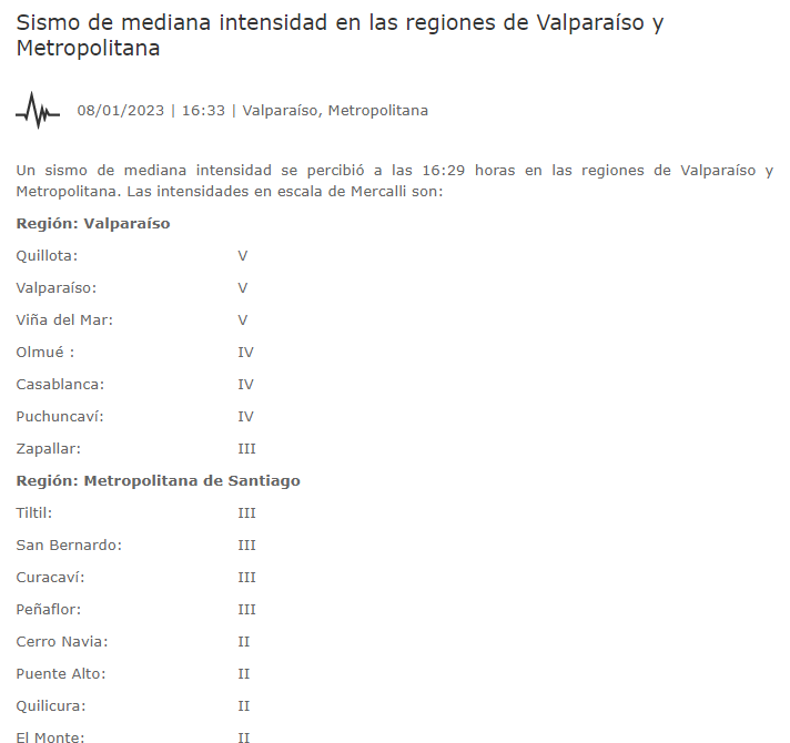 Este domingo a las 16:28 horas se registró un sismo de mediana intensidad con epicentro a 19 kilómetros al Sur Oeste de Quillota, en la Región de Valparaíso. Según los datos preliminares del Centro Sismológico de Chile, el temblor había alcanzado una magnitud de 4.2 grados y una profundidad de 60 km.   En tanto, desde el Servicio Nacional de Prevención y Respuesta ante Desastres (SENAPRED), indicaron que el sismo se percibió de V grados en la escala de Mercali en las comunas de Quillota, Valparaíso y Viña del Mar.  En la Región Metropolitana, se logró sentir en Tiltil, San Bernardo, Curacaví y Peñaflor con III grados.