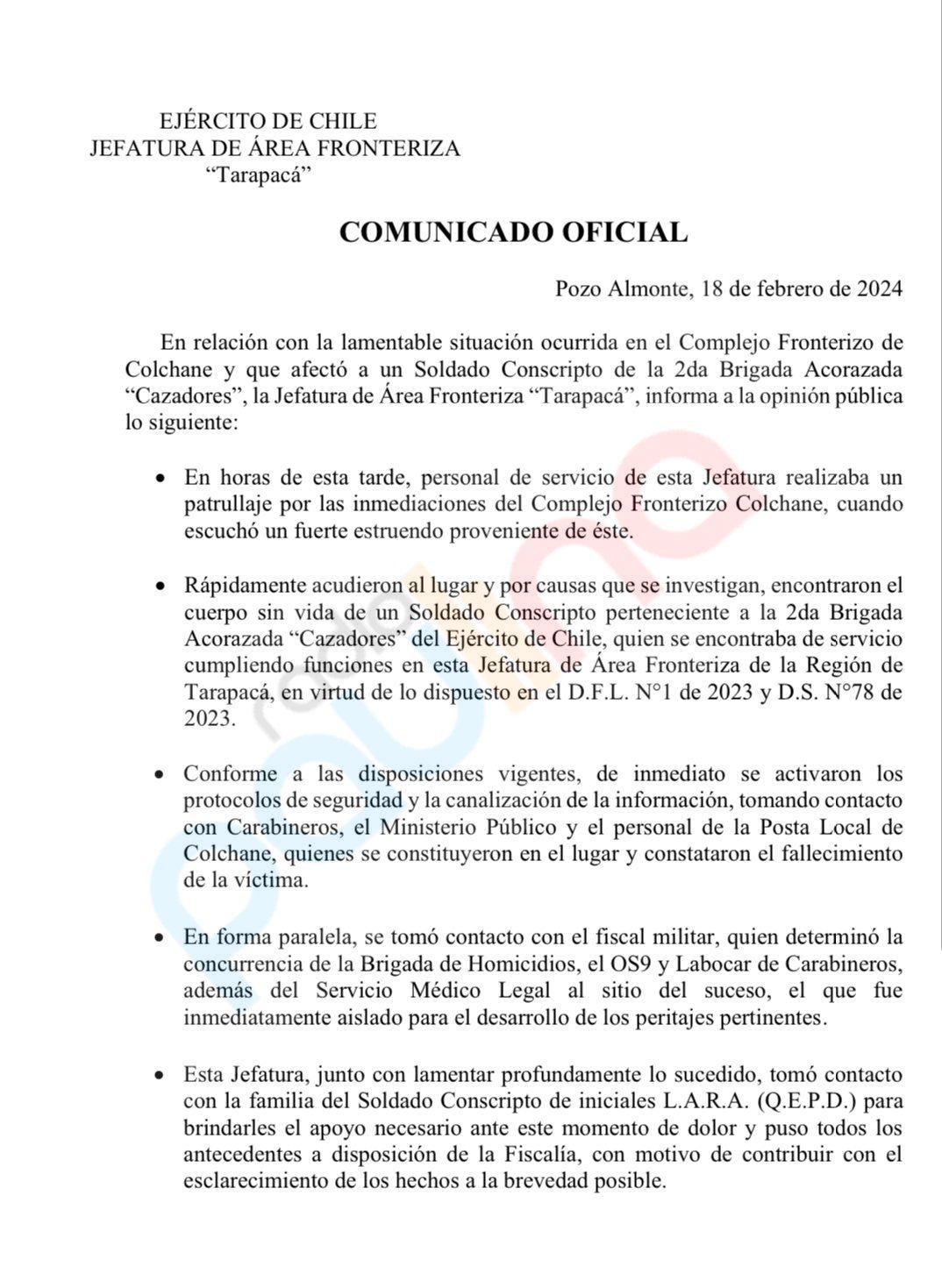 muerte de un conscripto en el Complejo Fronterizo de Colchane, cuyo cuerpo fue encontrado por personal de la Jefatura de Área Fronteriza de Tarapacá durante el pasado domingo.