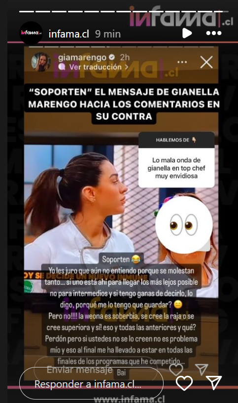 En un historia de Instagram que ya fue borrada, la ex chica reality respondió a los usuarios que critican su actitud confrontacional en el programa de cocina. "Yo les juro que aún no entiendo porque se molestan tanto, uno está ahí para llegar lo más lejos posible, no para intermediarios y si tengo ganas de decirlo, lo digo, ¿Por qué me lo tengo que guardar?", expresó. Además, agregó: "Pero no, una es soberbia, se cree la raja o se cree superiora y sí, eso y todas las anteriores, y qué". "Perdón, pero si ustedes no se lo creen no es problema mío y eso me ha llevado a estar en todas las finales de los programas que he competido", concluyó el descargo.