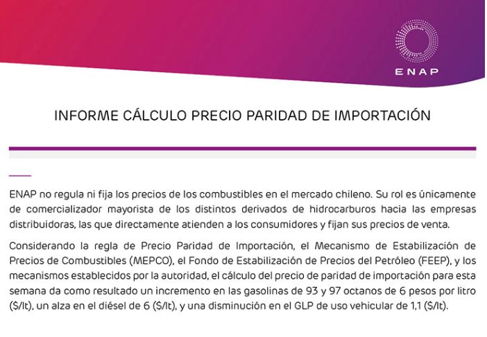 En su informe semanal, la Empresa Nacional del Petróleo (ENAP) entregó el detalle de la subida de los precios de algunos combustibles que se hará efectiva de este jueves.