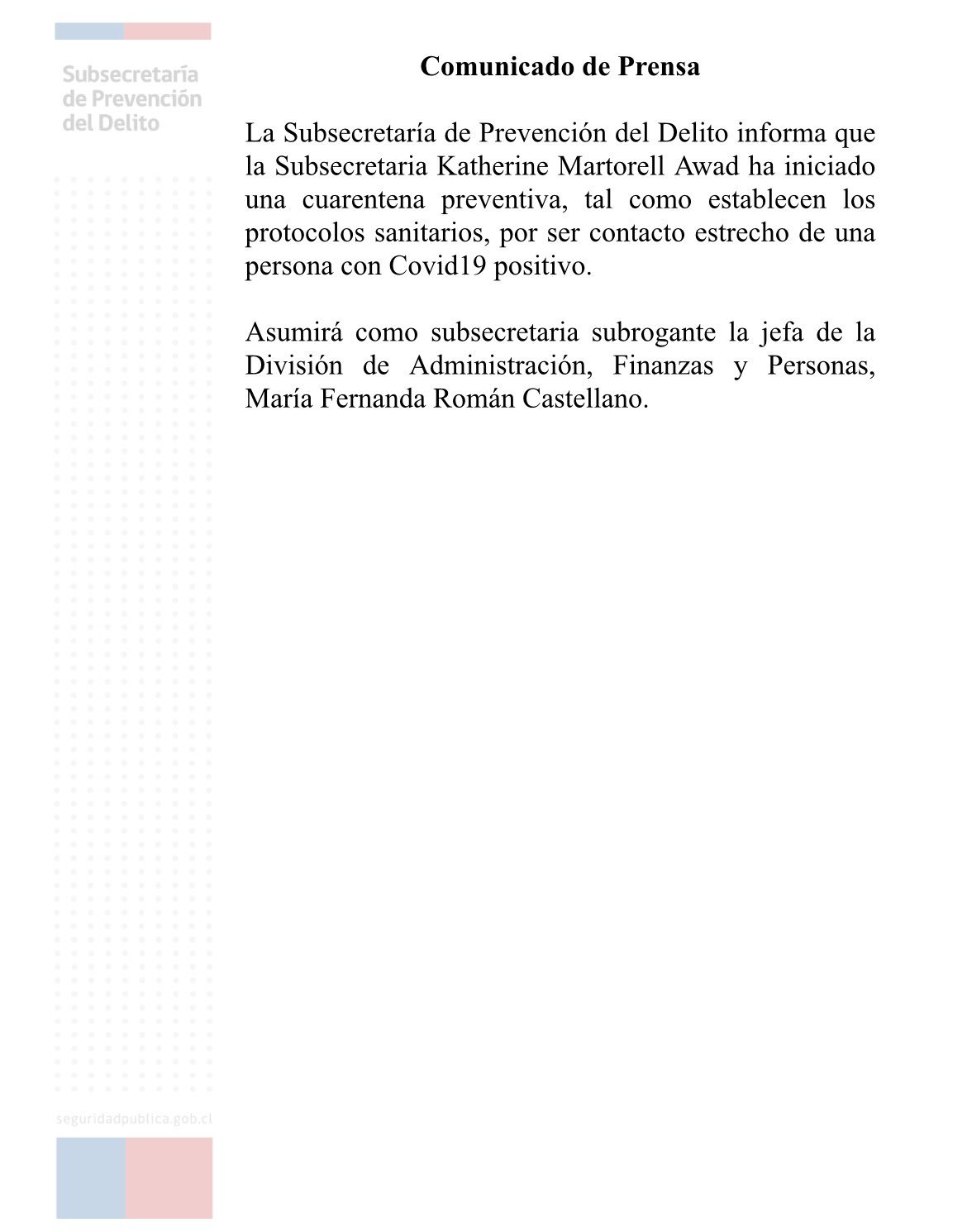 “La Subsecretaría de Prevención del Delito informa que la subsecretaria Katherine Martorell Awad ha iniciado una cuarentena preventiva, tal como establecen los protocolos sanitarios, por ser contacto estrecho de una persona con Covid-19 positivo”, señalaron en un comunicado.