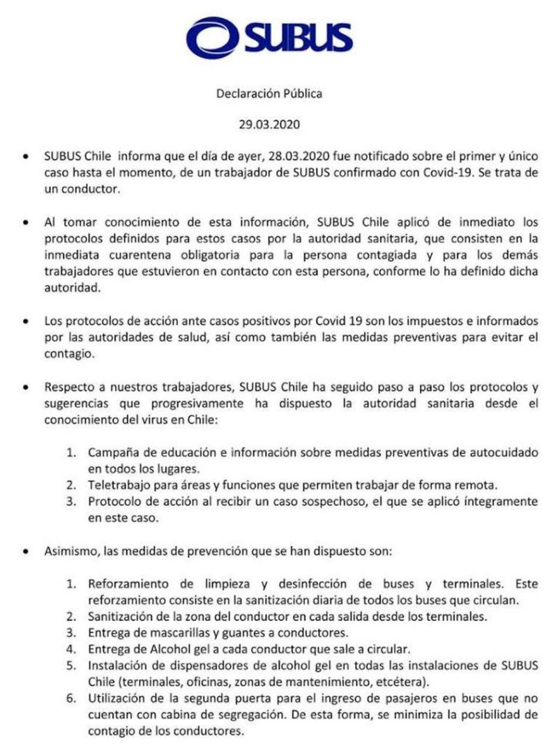 Además, Subus aseguró que ha llevado a cabo una campaña educativa y de información respecto a las medidas de auto cuidados en todos los lugares de trabajo, que ha implementado el teletrabajo en las áreas que así lo permiten, y que manejan un protocolo de acción al recibir un caso sospechoso, “el que se aplicó íntegramente" en esta ocasión.