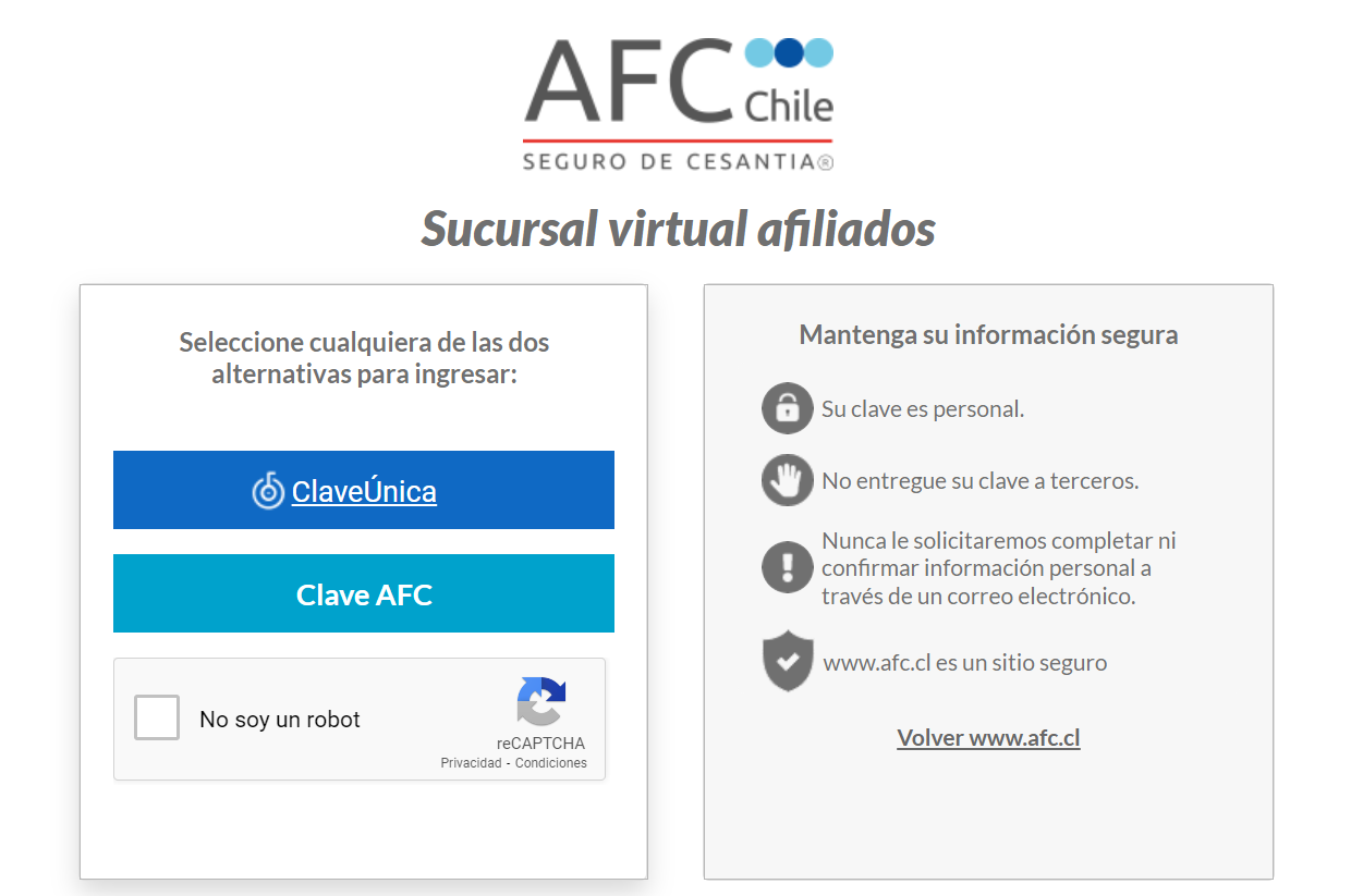 Ingresa a la sucursal virutal de la AFC para conocer más detelles, ingresando con tu RUT y clave de acceso o con la ClaveÚnica.