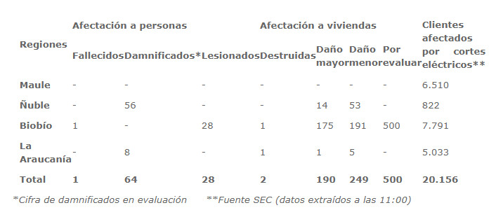 Fue el caso de algunos hogares en las regiones más afectadas: en la Región del Biobío, 175 resultaron con daño mayor, otras 191 con daño menor; y cerca de 20 mil hogares afectados sin suministro eléctrico en dicha región, en la de Ñuble, Los Lagos, La Araucanía y Maule.