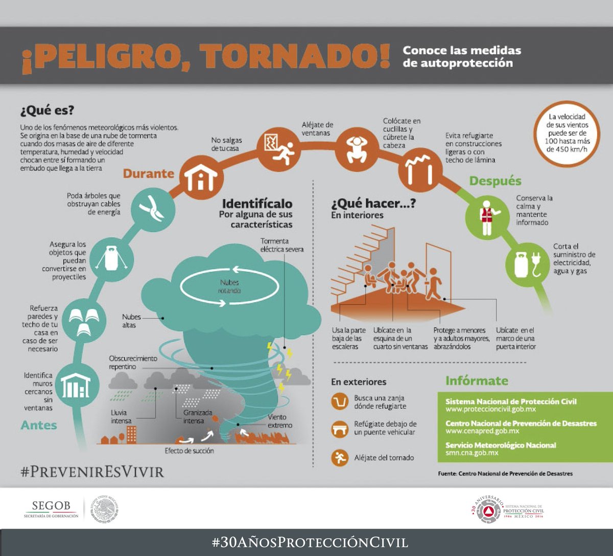 Señales que indican que podría formarse un tornado o tromba marina: Una nube grande, obscura y rotante de la que se desprende una forma de embudo, o Un ruido fuerte, similar al sonido de un tren de carga o varios camiones acercándose. Más info --> https://t.co/nyhdwzxLRb