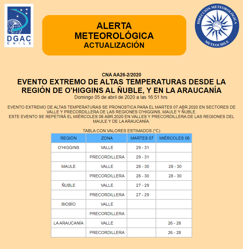 La Dirección Meteorológica de Chile actualizó una alerta por un evento extremo de altas temperaturas máximas que en un principio se pronosticaba para el martes 7 de abril en sectores de valle y precordillera de las regiones de OHiggins, Maule y Ñuble.