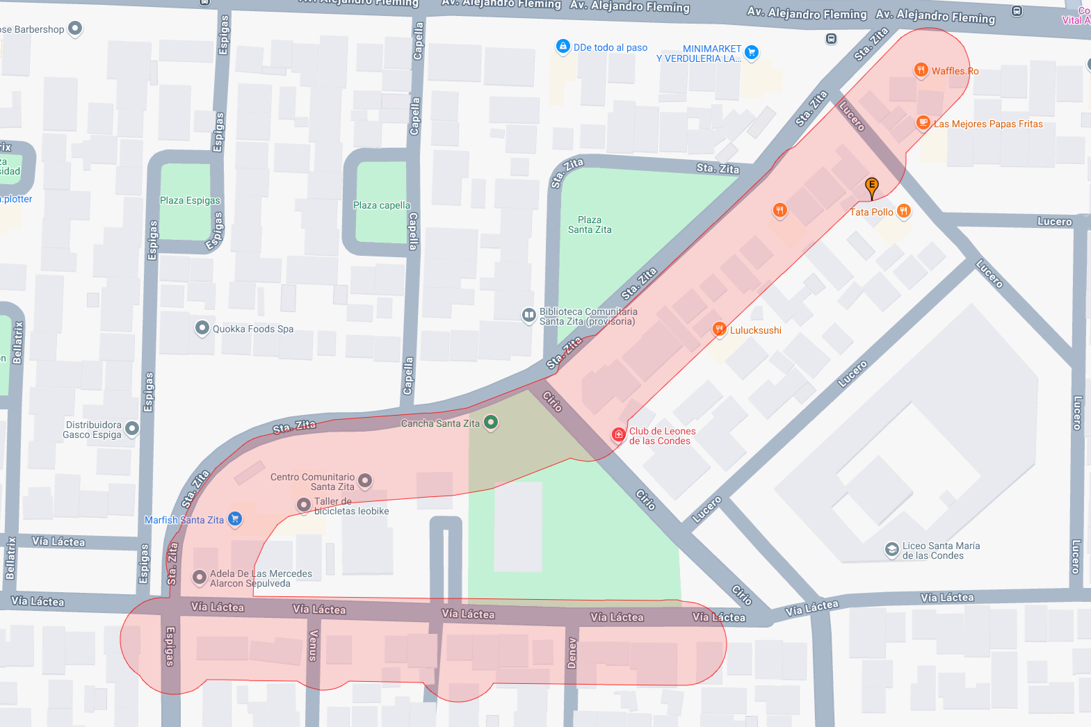 Las calles afectadas son partes de Santa Zita, Lucero, Vía Láctea, Espigas, Venus y Denev. A continuación puedes revisar el detalle (el área roja es la zona sin suministro de agua):