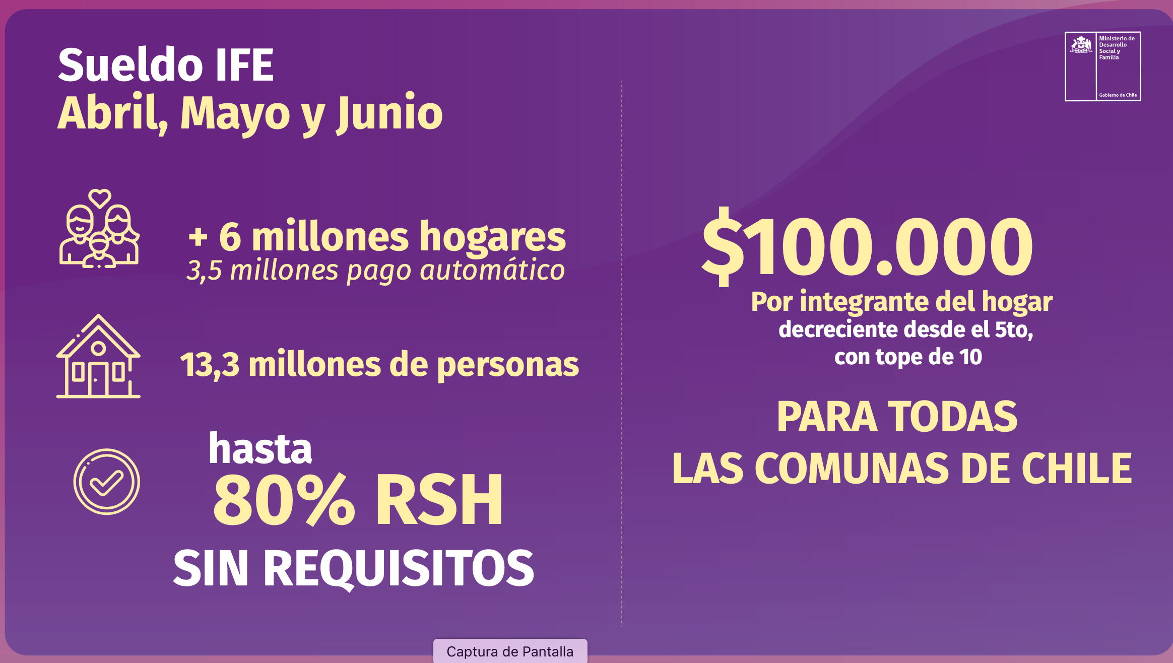Sumado a lo anterior, el presidente añadió que "las 10,7 millones de personas que ya recibieron el Ingreso Familiar de Emergencia este mes de abril, recibirán el IFE de los meses de mayo y junio en forma totalmente automática y sin ningún trámite".