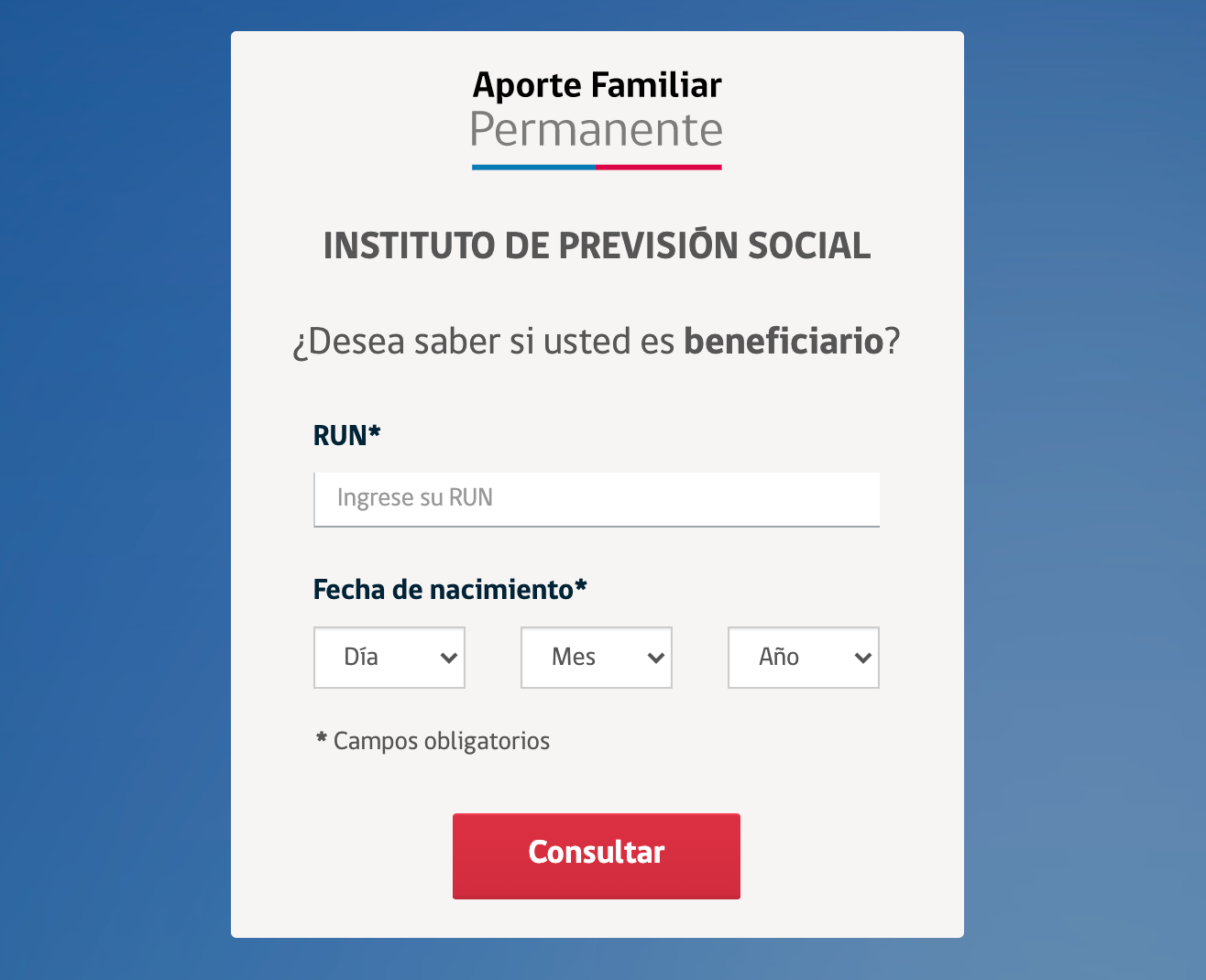 Para ello, debes acceder al sitio web https://consulta.aportefamiliar.cl/afper-consulta/consultaBeneficio e ingresar con el RUT y fecha de nacimiento.