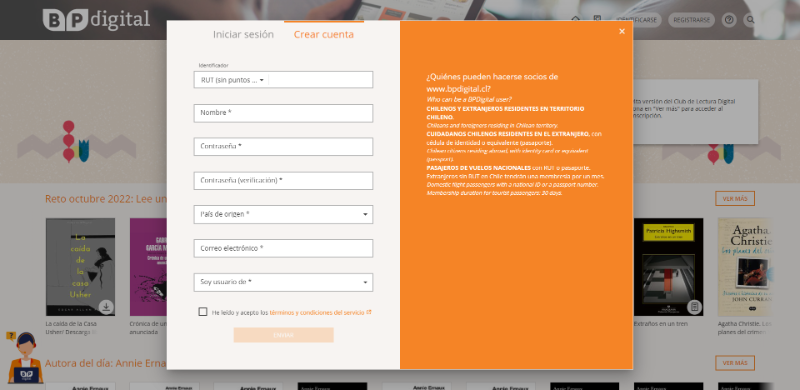 El proceso para registrarse en la Biblioteca Pública Digital es bastante sencillo. En primer lugar, debes ingresar a la página web (www.bpdigital.cl) y apretar el botón que dice Registrarse en la esquina superior derecha.