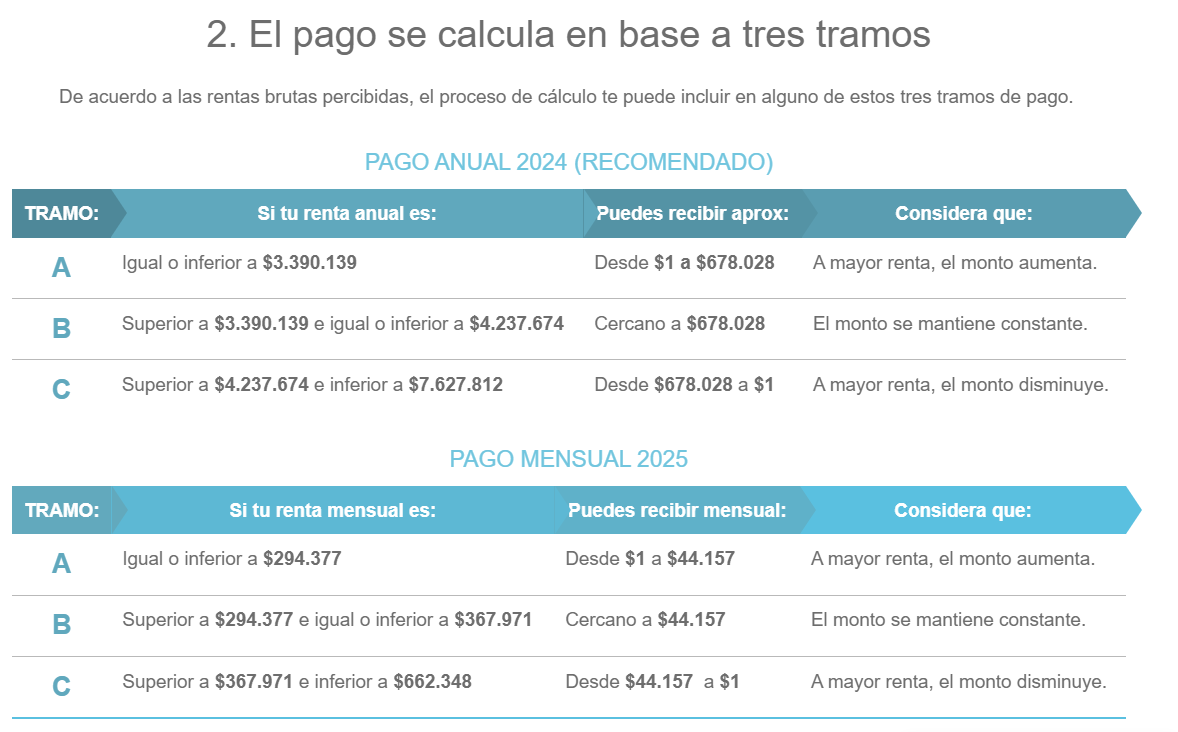 En el caso de las postulaciones para el pago anual que ya se realizó en agosto, fueron beneficiadas las mujeres cuyos ingresos no superaban los $7.948.180. Mientras que en el caso del pago mensual, la renta debe ser inferior a $635.651 brutos.