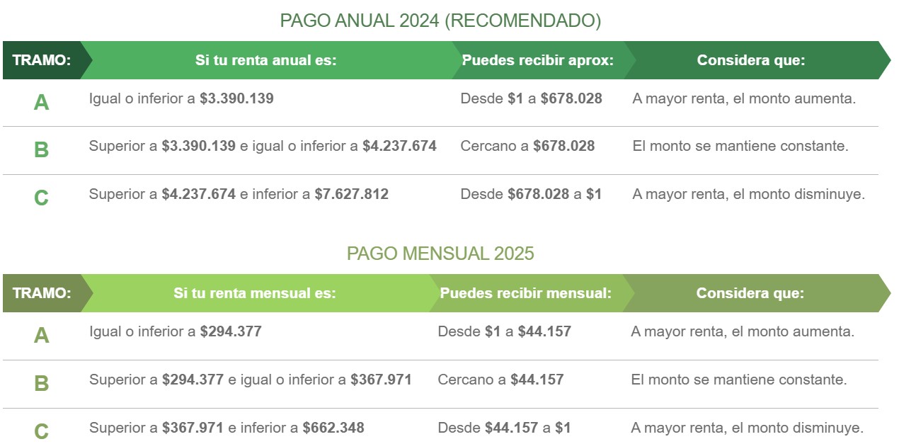 Pago anual: Se entrega una vez al año, en una sola cuota, y corresponde al 100% del beneficio, calculado en base a la renta del año anterior.