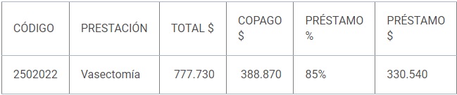 En la siguiente tabla, puedes ver el código del procedimiento, lo que sería el pago total, el monto de copago, el porcentaje de préstamo y el lo que corresponde en cifras de dinero a este último.