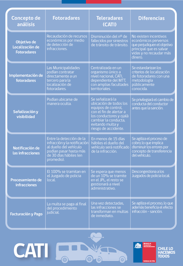 Durante ayer martes, se aprobó en el Congreso el proyecto de Ley CATI, iniciativa que permitirá crear el Centro Automatizado de Tratamiento de Infracciones (CATI)plataforma dedicada a la fiscalización de automóviles mediante una red automatizada, es decir, sin la presencia de Carabineros o inspectores fiscales. Este centro, que contará con cámaras de fiscalización debidamente señalizadas en las zonas de control, se hará cargo de la detección, notificación y tramitación de las infracciones, según lo estipulado por la normativa que debió esperar alrededor de nueve años para ser aprobada e implementada. De este modo, realizará sus funciones bajo la facultad del Ministerio de Transportes y Telecomunicaciones (MTT), quienes dispondrán de la red automatizada para fiscalizar a los conductores.