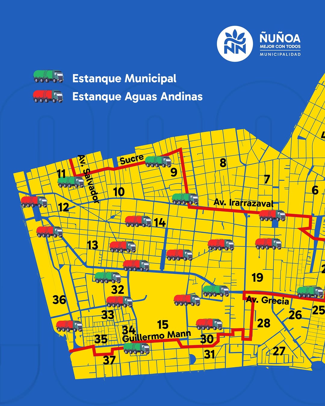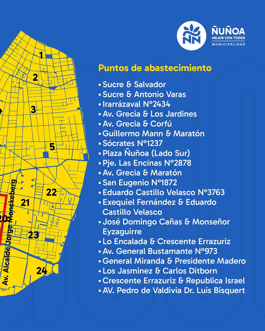 Ante lo extenso de la interrupción y las altas temperaturas que afectarán a la capital, la Municipalidad de Ñuñoa informó que dispondrá puntos de abastecimiento de agua: