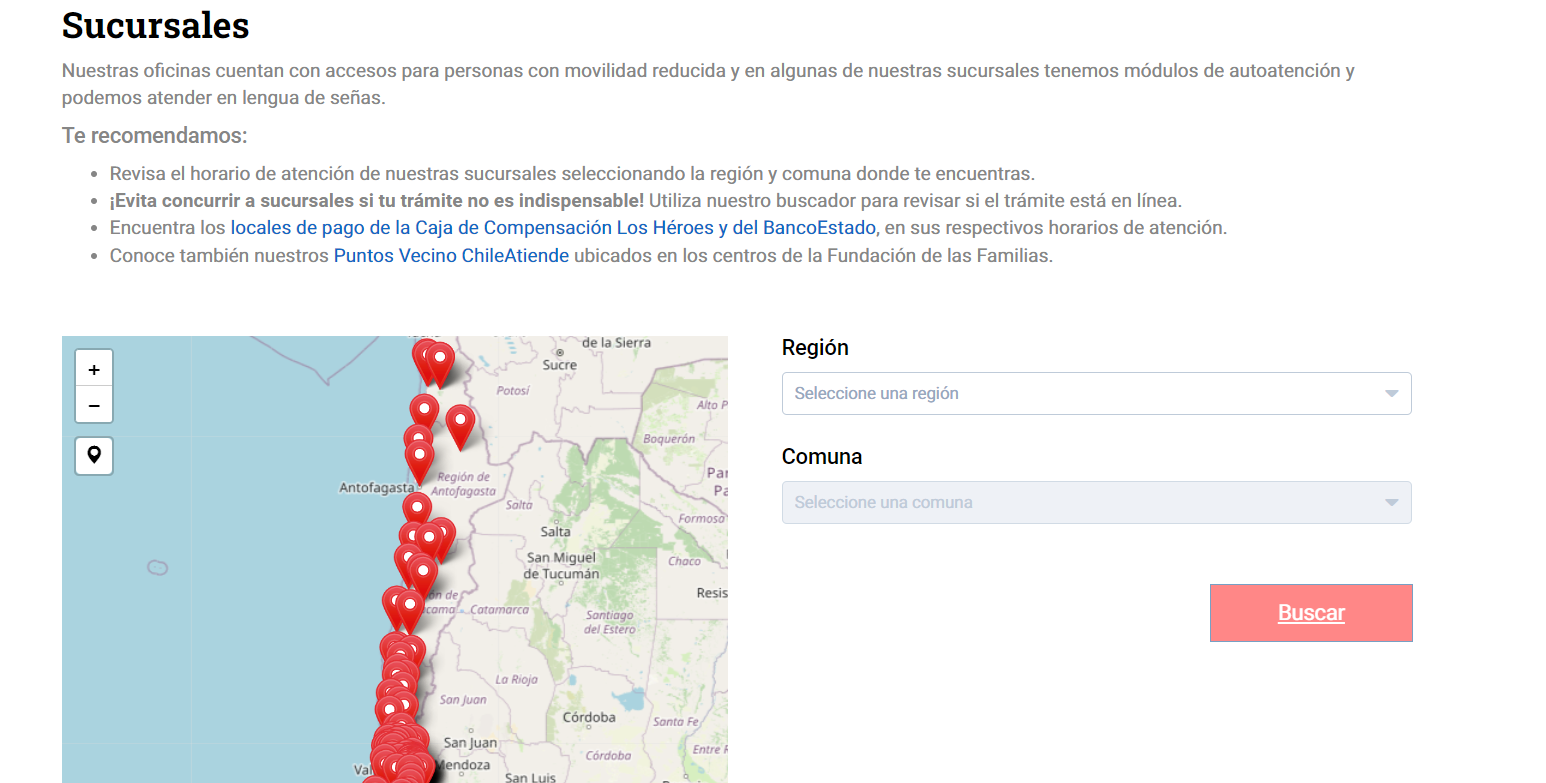 Una vez en el sitio web, deberás ingresar tu región y comuna, y automáticamente el sistema te mostrará la ubicación de las sucursales más cercanas a tu ubicación.