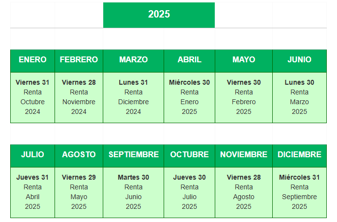 El pago provisional mensual se efectúa con un desfase de tres meses, de ese modo, el calendario 2025 queda de esta forma: